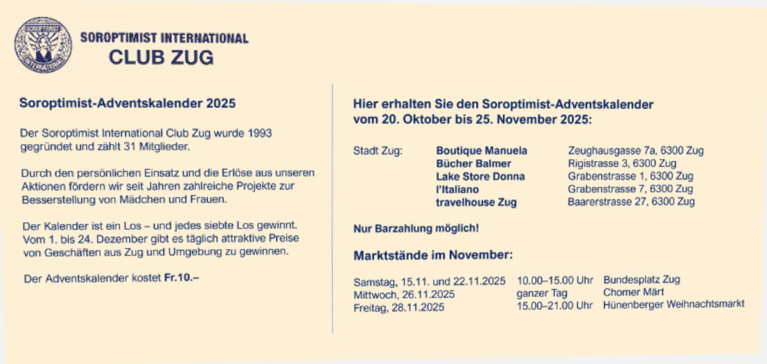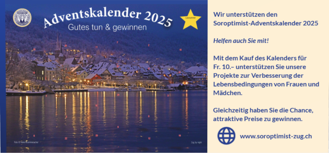 Die ausgelosten Gewinn-Nummern werden ab 1. Dezember 2025 täglich auf dieser Seite publiziert. Dazu öffnen Sie das jeweilige Türchen. Sie finden die Gewinne auch auf dem Soroptimist Club Zug Insta-Account: soroptimist_zug.